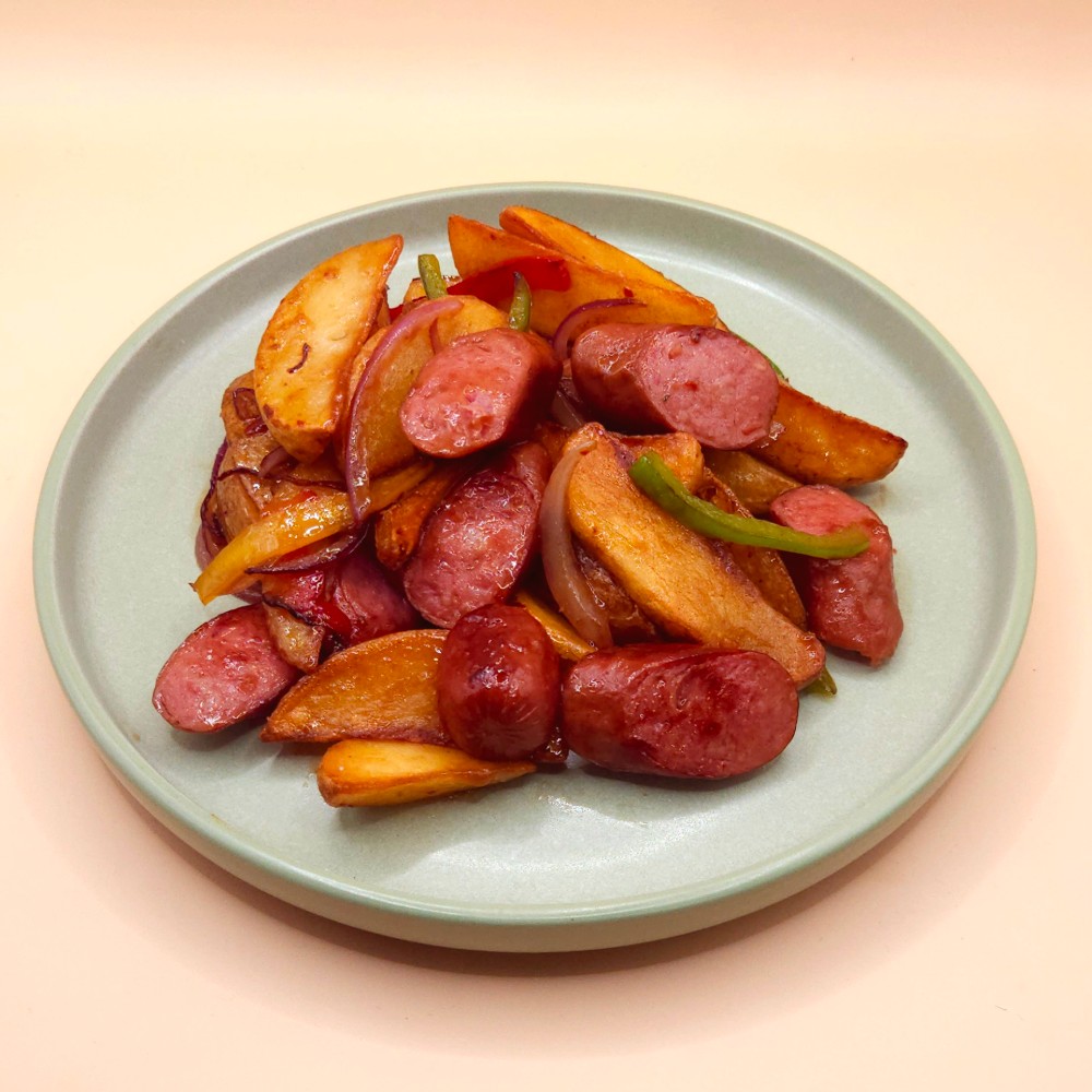 Картопля по-селянські зі смаженими ковбасками