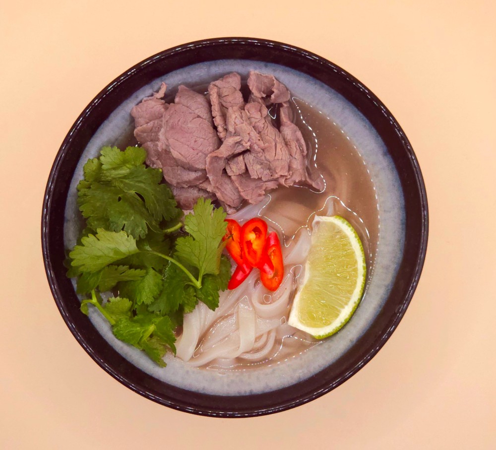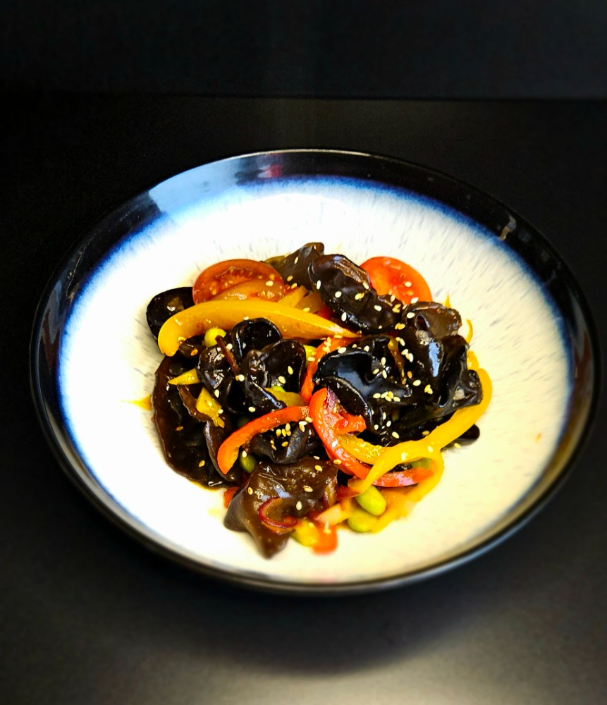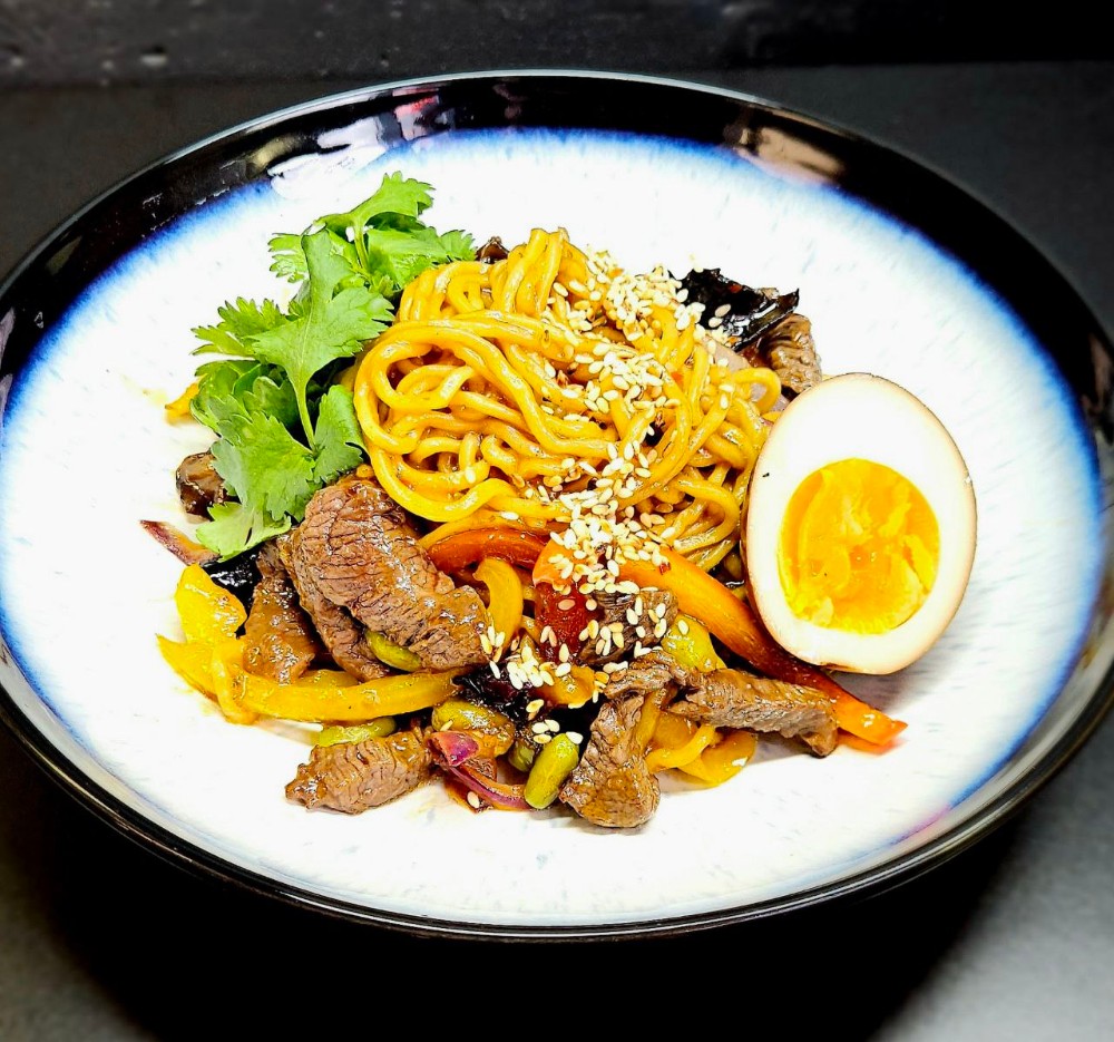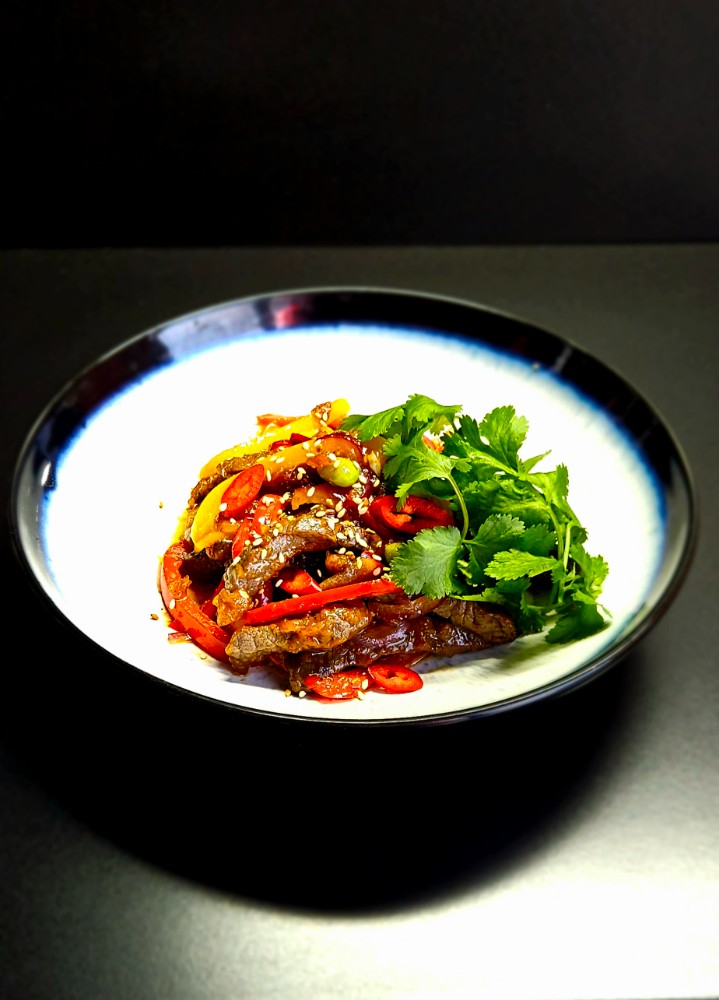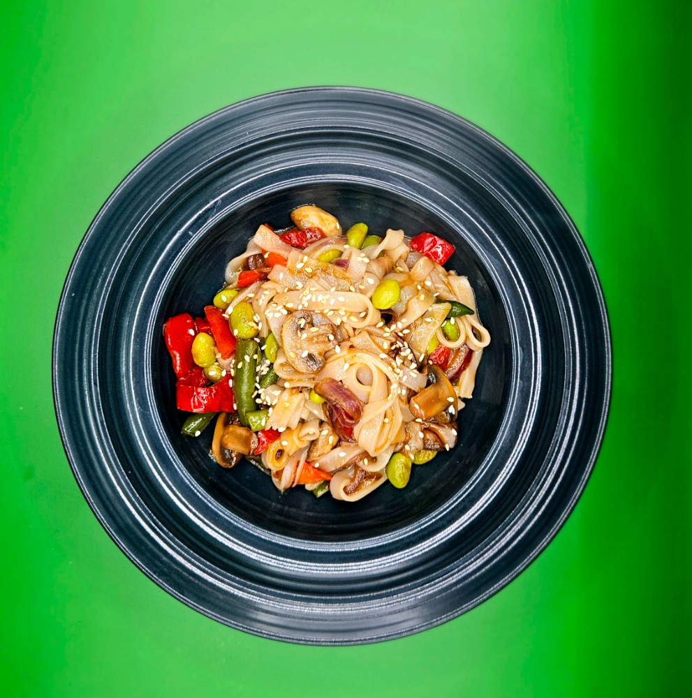 250 гр. Яловичина, цибуля синя, перець болгарський, боби адамаме, перець чілі, соус падтай , кунжут, кінза.