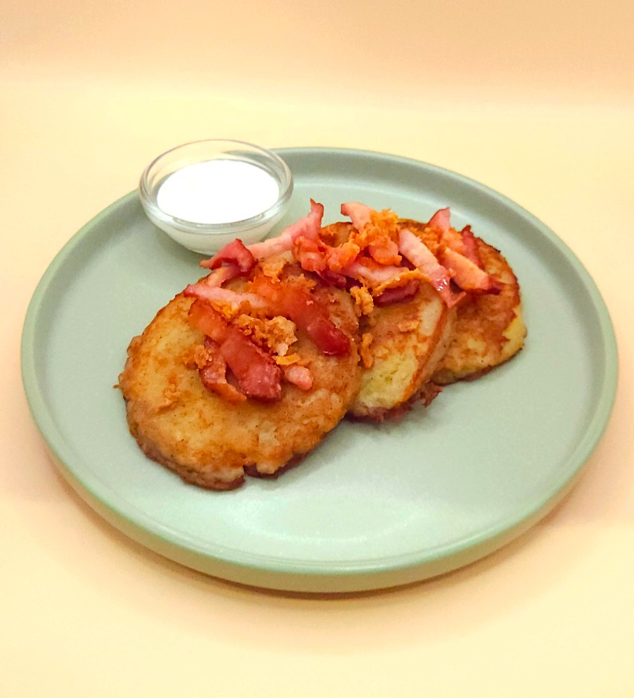 Деруни з беконом та цибулькою кріспі
